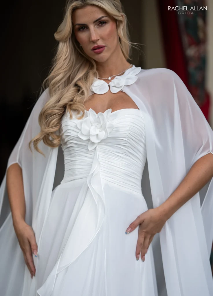 Etéreo y elegantemente natural, este vestido en chiffon marfil fluye con ligereza y un movimiento suave. Delicados acentos florales en 3D adornan el corsé, mientras que la capa opcional cae detrás como un susurro de romance. Una opción soñada para ceremonias al aire libre, bodas en jardín o para cualquier novia que busque un brillo ligero y de inspiración divina.